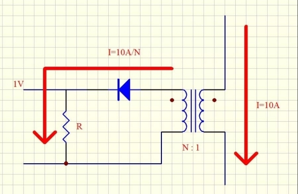 假定用電流互感器檢測變換器的原邊電流,原邊10A電流對應(yīng)1V電壓。當(dāng)然,咱們能夠用一個1V/10A=100mΩ的電阻來檢測,可是電阻將構(gòu)成的損耗為1V×10A=10W,這么大的損耗對幾乎一切的規(guī)劃來說都是不能承受的。所以,要選用電流互感器,如圖1所示。